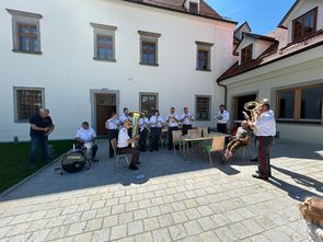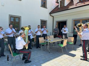 Pünktlich nach den Kanonenschüssen durch die Bürgergarde maschierte die Bürgerkorpskapelle um 06:00 Uhr durch den Ort. Nach einem anschließenden Frühstück und einer Einladung bei unserem Ehrenmitglied Franz Pechböck wurde die Kapelle in zwei Gruppen geteilt und ist mit Traktoren und Anhängern ausgefahren.